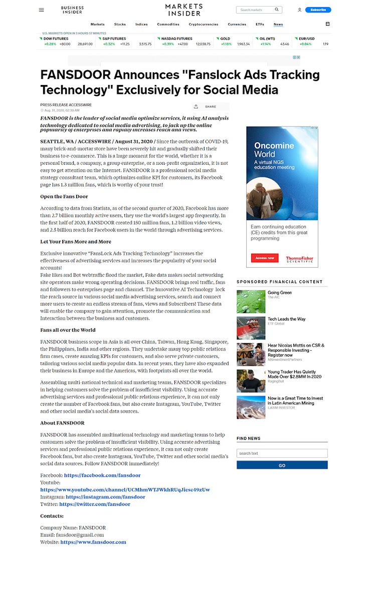 (2020 年 8 月 31 日) 粉絲多 Fansdoor 全球團隊再次贏得北美媒體關注,Business Insider 與 NBC 聯手報導我們的「Fanslock Ads Tracking Technology」技術,使用這個特別的技術您的粉絲專頁或文章將獲得真實曝光、接觸真實粉絲,報導中更讚揚官方粉絲專頁高達 130 萬粉絲的推廣成果值得信任。